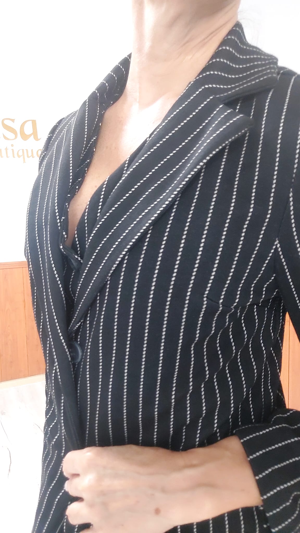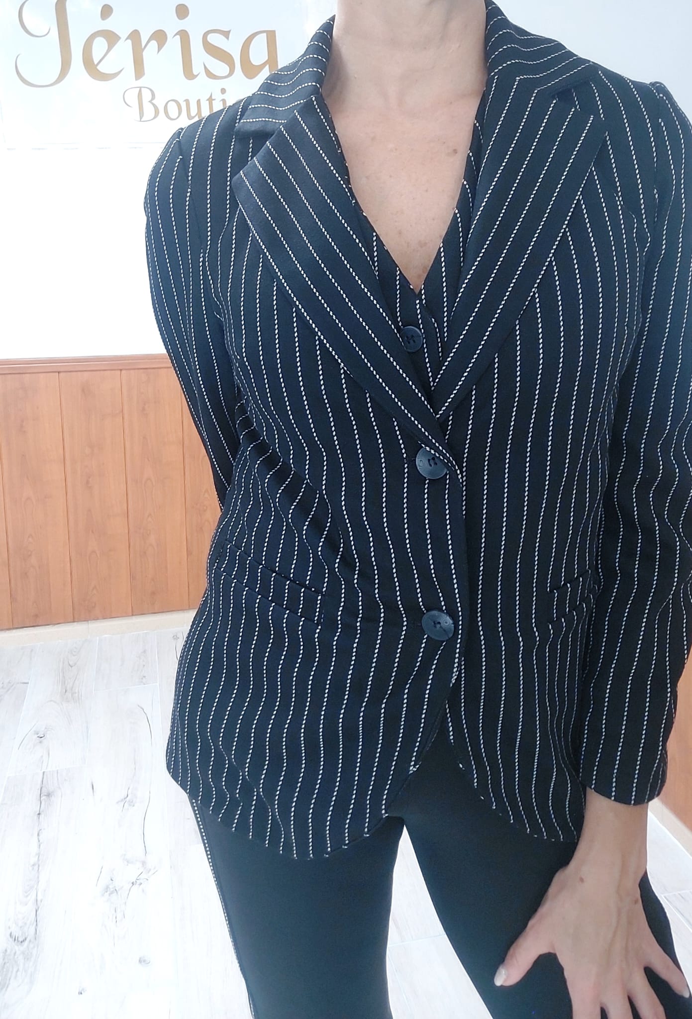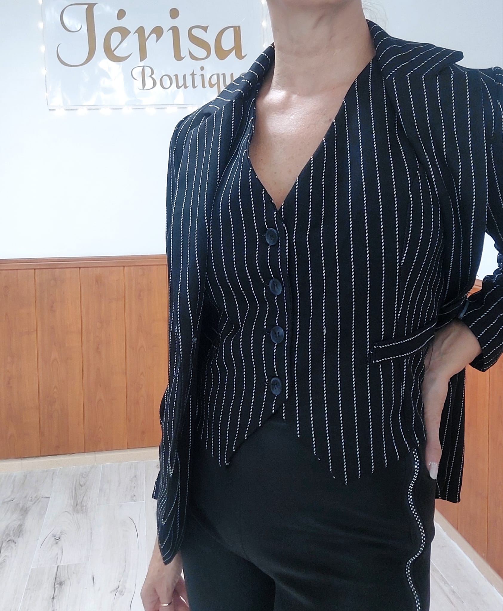 Blazer elegante en fondo negro con finas rayas blanca verticales,que estilizan la figura y aportan un toque sofisticado.Su corte moderno realza cualquier look,desde casual chic hasta más formal.Además, se puede combinar a juego con chaleco para crear un conjunto coordinado,profesional y con mucho estilo.Ideal para oficina,eventos y looks urbanos con personalidad.