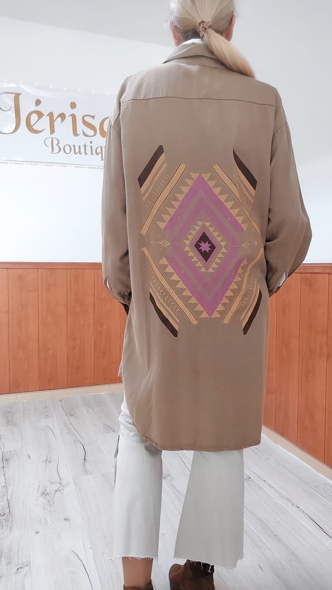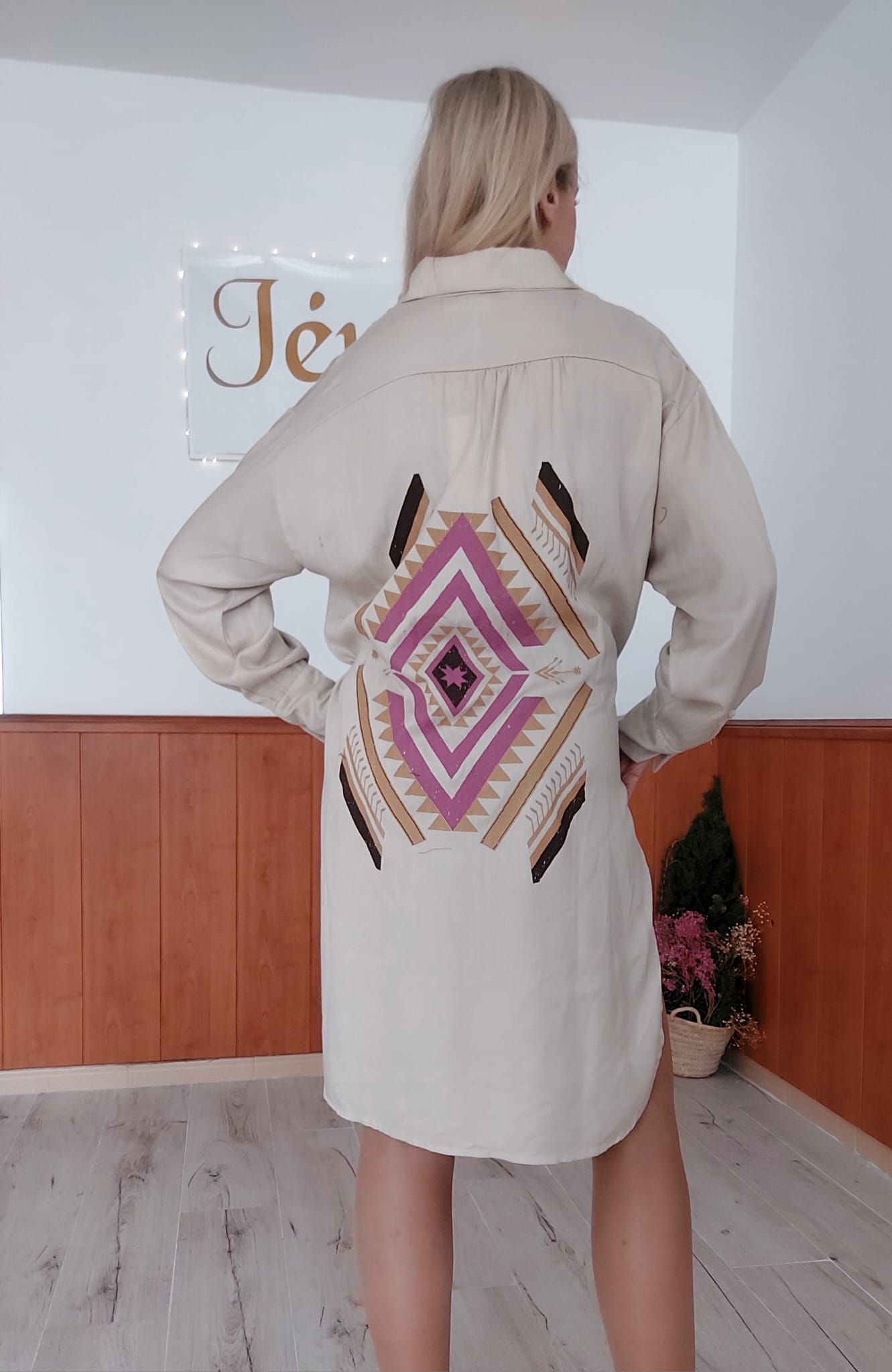 Vestido camisero disponible en color Beige y color Marrón, con espalda en diseño geométrico tribal, tonos malva, beige, marrón original y llamativo. La tela es suave, ligera y con buena caída, ideal para lucir cómoda sin perder estilo. Es un vestido perfecto para quienes buscan un modelo diferente, con personalidad y un detalle de espalda que marca la diferencia. Ideal para combinar con chaquetas blazer, denim ,botines, cuñas ,sandalias…según temporada.